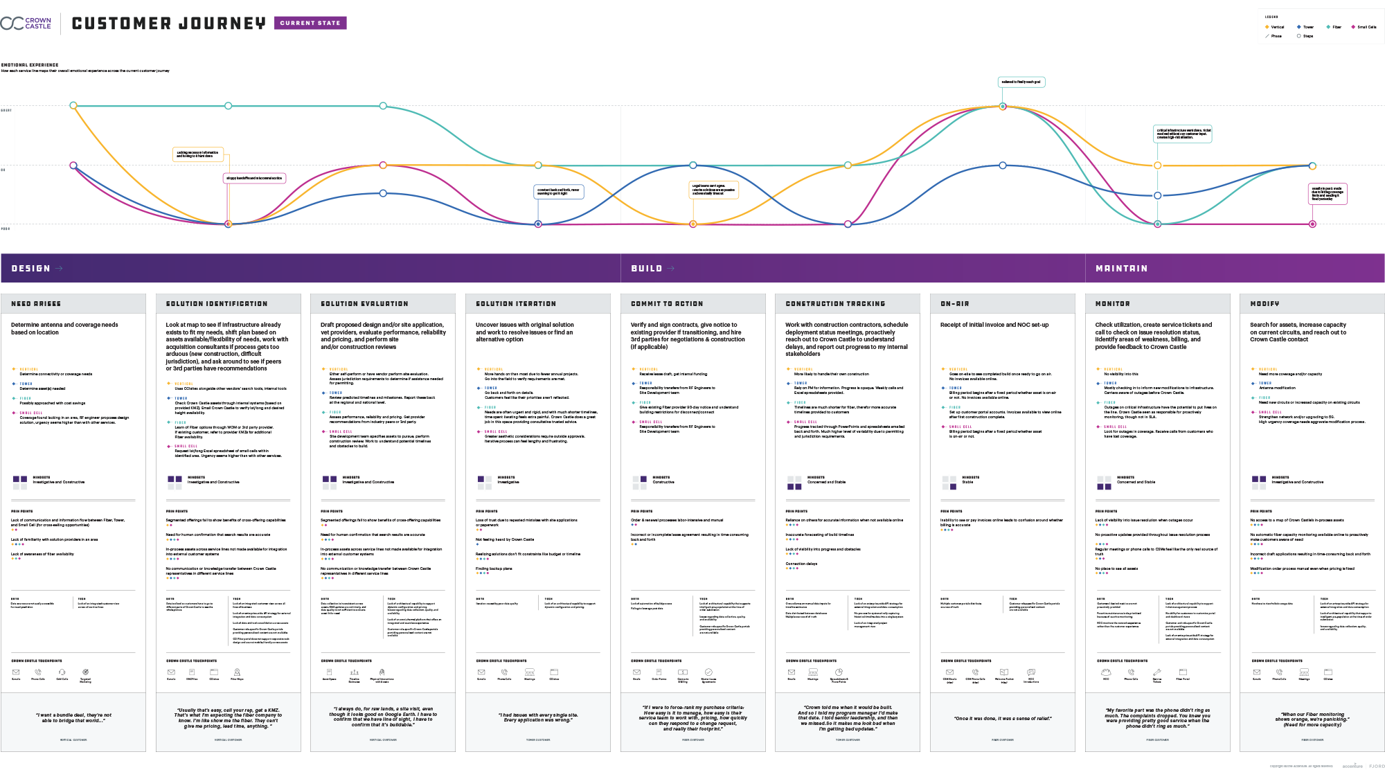 After thorough synthesis, we identified 3 stages of the customer journey shared across business units—Design, Build, Maintain—and captured each step within the 3 main stages. We also documented the technology, processes, and people involved at every touch point, and captured distinctions and similarities across business units.